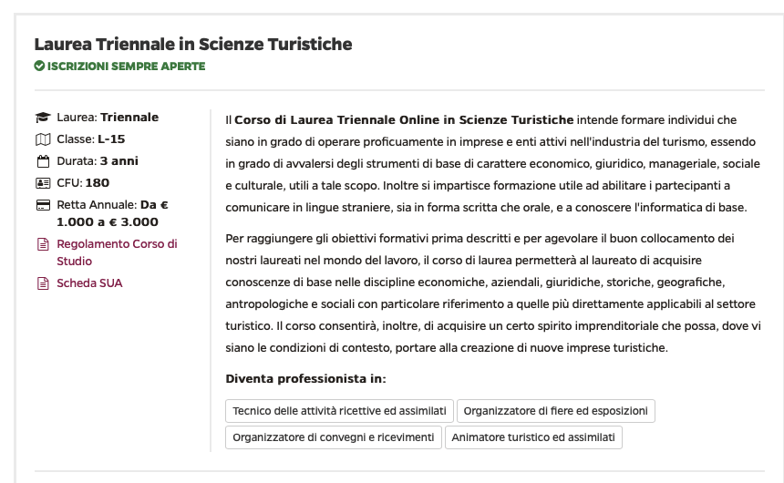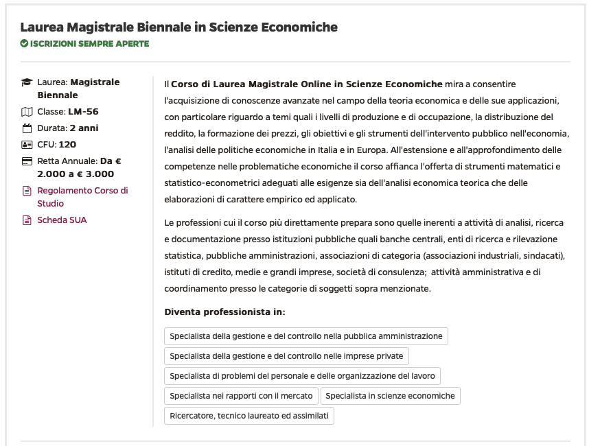 I percorsi didattici sono costantemente aggiornati per formare le figure professionali più richieste dal mercato del lavoro e per fornire competenze pratico-teoriche tipiche delle aree del sapere economico-aziendale, giuridico, umanistico, scientifico, biomedico e psicopedagogico.